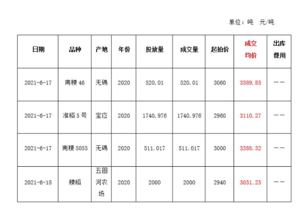 6月18日,最低收購價稻谷(2017-2020年)交易計劃銷售1814901噸,實際成交56822噸,較上周增加5247噸,成交率3.13%,最高成交價3030元/噸,最低成交價2420元/噸,成交均價2643.08元/噸,較上周上漲1.85元/噸。