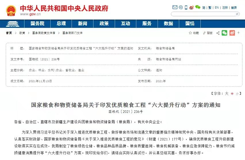 ——《糧食品種品質(zhì)品牌提升行動方案》:持續(xù)開展“中國好糧油”行動,聚焦增加綠色優(yōu)質(zhì)糧油產(chǎn)品供給,著力優(yōu)化糧食供給結(jié)構(gòu),促進(jìn)糧油品質(zhì)提升,打造優(yōu)質(zhì)糧食品牌,搞活糧食市場和流通,加快糧食產(chǎn)業(yè)創(chuàng)新發(fā)展、轉(zhuǎn)型升級、提質(zhì)增效。到2025年,優(yōu)質(zhì)糧食供給更加豐富,糧食品質(zhì)明顯提升,糧食品牌體系更加完善,糧油品牌和營銷市場競爭力持續(xù)提升。充分融合“好糧油”銷售示范點(diǎn)、糧食應(yīng)急供應(yīng)網(wǎng)點(diǎn)、軍糧供應(yīng)網(wǎng)點(diǎn)和主食廚房等,健全線上線下營銷體系,加快由“吃得飽”向“吃得好”“吃得營養(yǎng)健康”轉(zhuǎn)變。