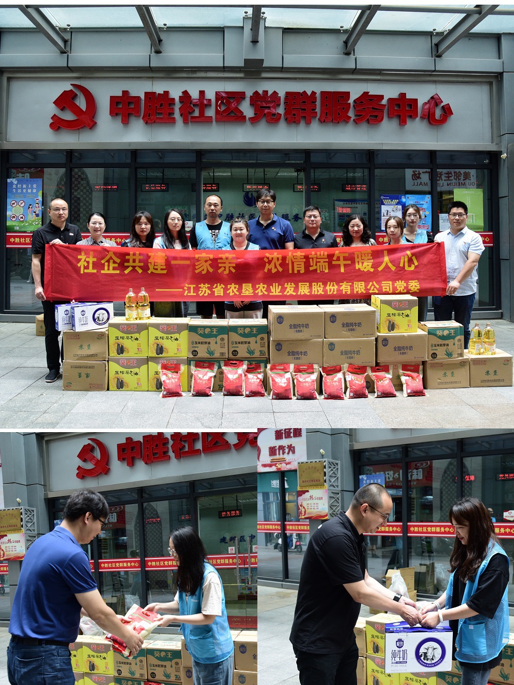 •        在端午節(jié)來臨前夕,為弘揚(yáng)中華傳統(tǒng)美德,加大與所轄社區(qū)共駐共建力度,營(yíng)造文明和諧的節(jié)日氛圍,6月21日,蘇墾農(nóng)發(fā)到建鄴區(qū)沙洲街道中勝社區(qū)開展“社企共建一家親 濃情端午暖人心”慰問活動(dòng),給社區(qū)一線網(wǎng)格員們送去慰問品和節(jié)日祝福。