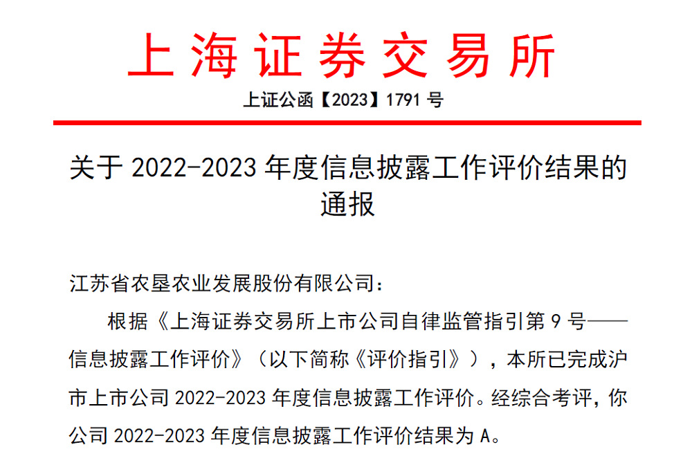 近日,上海證券交易所公布滬市主板上市公司2022-2023年度信息披露工作評(píng)價(jià)結(jié)果,蘇墾農(nóng)發(fā)(股票代碼:601952)再次榮獲信息披露工作“A”級(jí)評(píng)價(jià)(最高級(jí)),這也是公司連續(xù)第四年獲此殊榮,充分體現(xiàn)了證券監(jiān)管機(jī)構(gòu)對(duì)公司法人治理、信息披露和投資者關(guān)系維護(hù)等方面工作的高度肯定。
