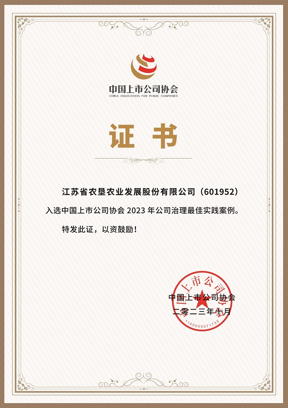 今年7月,中國上市公司協(xié)會(huì)分別開展了“2023年公司治理最佳實(shí)踐案例評(píng)選活動(dòng)”和“2023年上市公司鄉(xiāng)村振興最佳實(shí)踐創(chuàng)建案例評(píng)選活動(dòng)”,由相關(guān)領(lǐng)域?qū)<覍W(xué)者組成專家評(píng)審委員會(huì)對(duì)相關(guān)單位選送的實(shí)踐案例開展嚴(yán)格遴選及多輪評(píng)審,最終評(píng)選出入選公司治理最佳實(shí)踐案例的上市公司100家,入選上市公司鄉(xiāng)村振興優(yōu)秀實(shí)踐案例的上市公司109家,兩項(xiàng)評(píng)選活動(dòng)蘇墾農(nóng)發(fā)均成功入選。