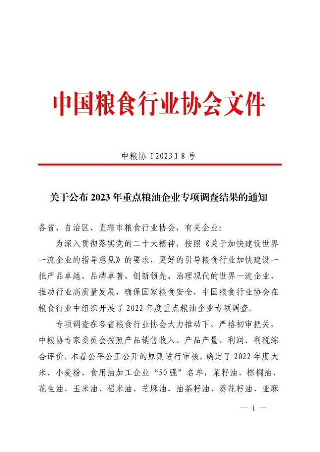 此次專(zhuān)項(xiàng)調(diào)查是在各省糧食行業(yè)協(xié)會(huì)大力推動(dòng)下,嚴(yán)格初審把關(guān),中糧協(xié)專(zhuān)家委員會(huì)按照產(chǎn)品銷(xiāo)售收入、產(chǎn)品產(chǎn)量、利潤(rùn)、利稅綜合評(píng)價(jià),本著公平公正公開(kāi)的原則進(jìn)行了審核。此次入圍50強(qiáng)名單的企業(yè),為產(chǎn)品銷(xiāo)售收入達(dá)到1億元以上的大米加工企業(yè)、小麥粉加工企業(yè)、食用植物油(含大豆油、菜籽油、棕櫚油等大宗油脂及食用調(diào)和油)加工企業(yè),且在最近三年內(nèi)未發(fā)生過(guò)質(zhì)量安全問(wèn)題。
