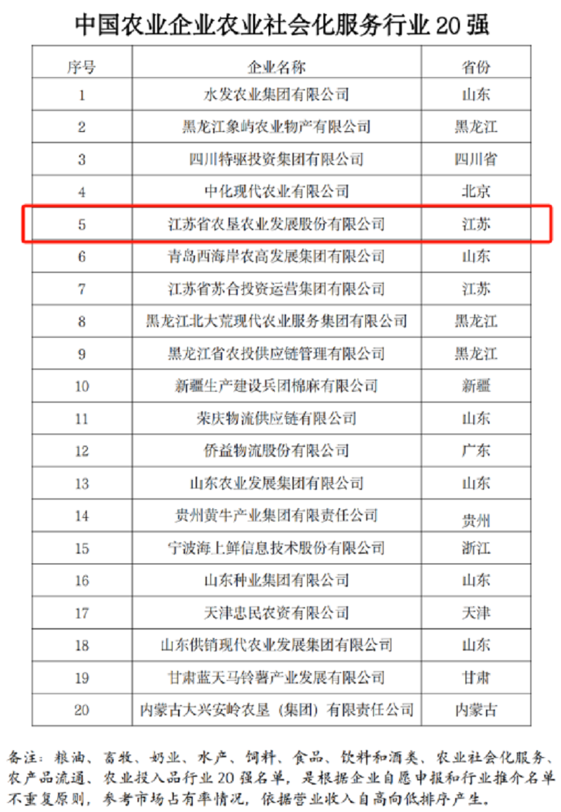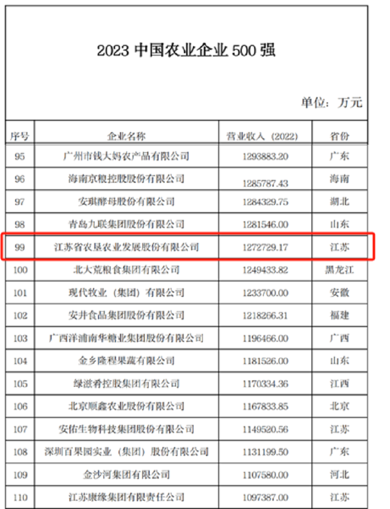 近日,農(nóng)民日?qǐng)?bào)社發(fā)布了2023中國(guó)農(nóng)業(yè)企業(yè)500強(qiáng)名單,蘇墾農(nóng)發(fā)再次成功入選,位列第99位,較去年提升22位;此次活動(dòng)還評(píng)選了2023中國(guó)農(nóng)業(yè)企業(yè)行業(yè)20強(qiáng)名單,蘇墾農(nóng)發(fā)再次入選農(nóng)業(yè)社會(huì)化服務(wù)行業(yè)20強(qiáng),位列第5位,較去年上升1位。再度入選中國(guó)農(nóng)業(yè)企業(yè)500強(qiáng)、中國(guó)農(nóng)業(yè)企業(yè)行業(yè)20強(qiáng),標(biāo)志著蘇墾農(nóng)發(fā)行業(yè)地位得到進(jìn)一步認(rèn)可和鞏固,競(jìng)爭(zhēng)優(yōu)勢(shì)得到進(jìn)一步凸顯和提升。