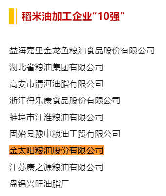 近日,中國糧食行業(yè)協(xié)會根據(jù)《關(guān)于進行2024年度重點糧油企業(yè)和各省糧油加工業(yè)專項調(diào)查的通知》(中糧協(xié)〔2024〕2號),組織行業(yè)專家開展了2023年度重點糧油企業(yè)專項調(diào)查,按照產(chǎn)品銷售收入、產(chǎn)量、產(chǎn)能、利稅、利潤等指標綜合審定,公示了2023年度重點糧油企業(yè)專項調(diào)查結(jié)果。金太陽糧油股份有限公司再度入選食用油加工企業(yè)“50強”、玉米油加工企業(yè)“10強”、稻米油加工企業(yè)“10強”、葵花籽油加工企業(yè)“10強”、亞麻籽油加工企業(yè)“10強”等5項榜單,首次入選菜籽油加工企業(yè)“10強”榜單。