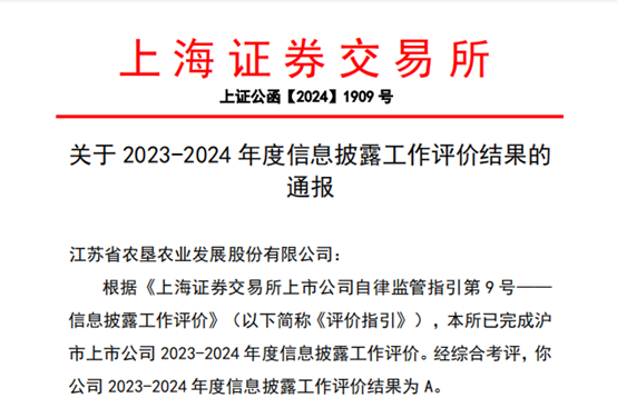 近日,上海證券交易所(以下簡稱“上交所”)完成對滬市上市公司2023—2024年度信息披露工作評價,經(jīng)綜合考評,蘇墾農(nóng)發(fā)(股票代碼:601952)在2023-2024年度上海證券交易所的信息披露工作考核中,獲評最高等級“A”級,上市以來,蘇墾農(nóng)發(fā)連續(xù)5年獲此殊榮。
